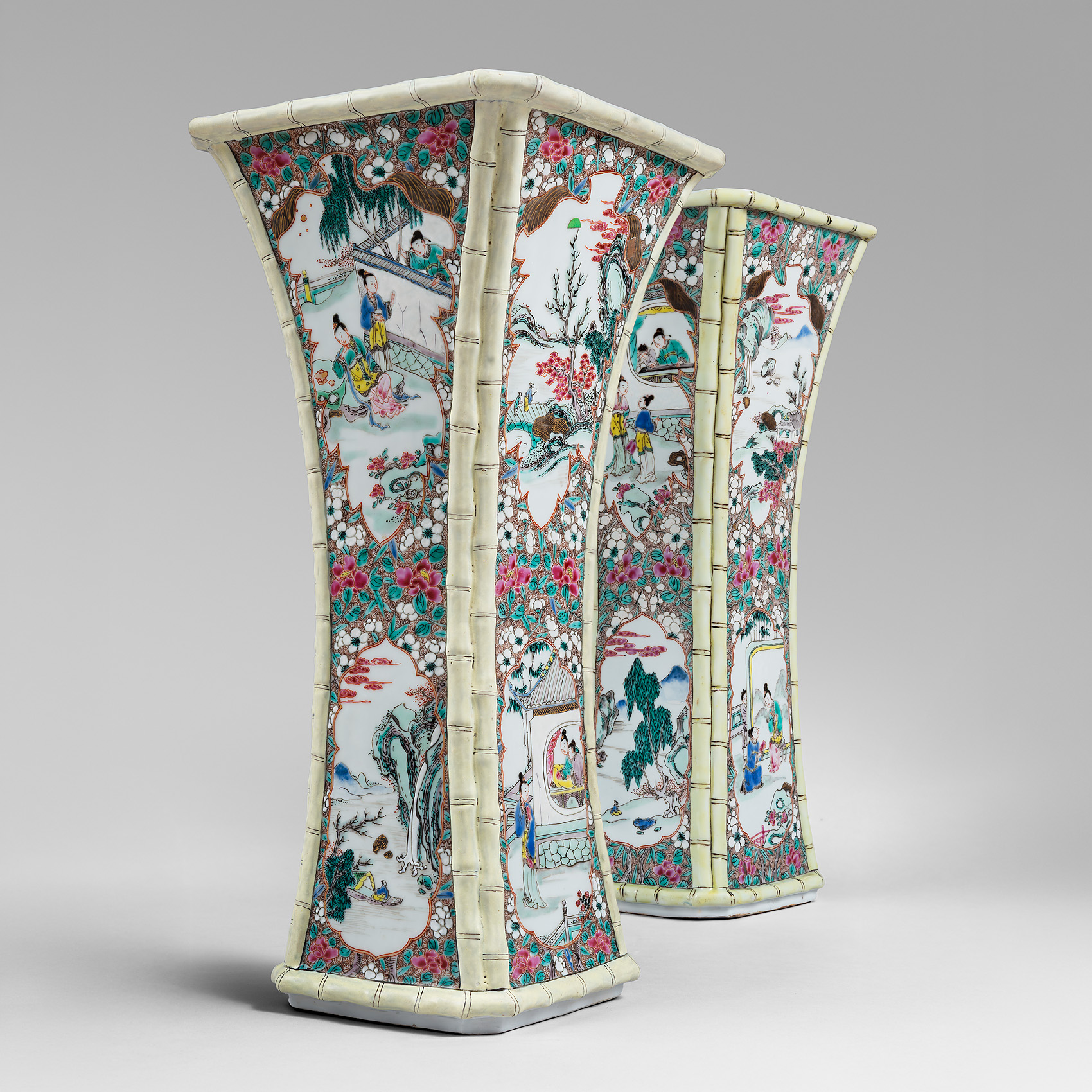 Paire de vases couverts monumentaux famille rose à décor d’une scène de chasse impériale. Chine, Yongzheng