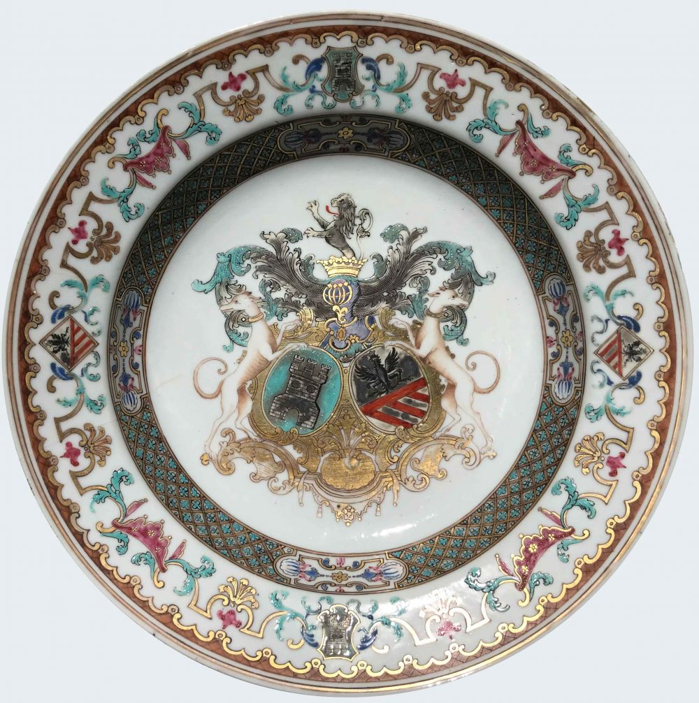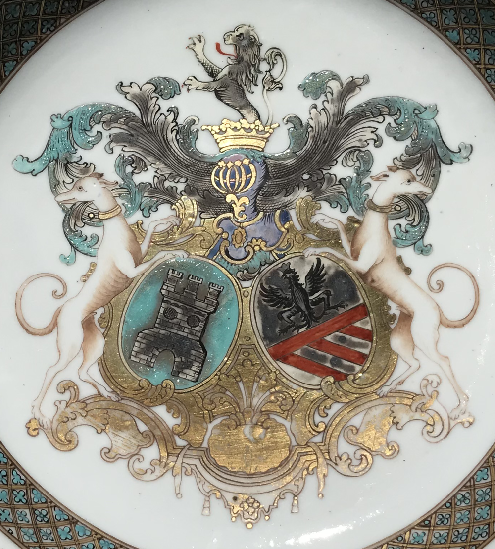 Un service similaire, dans le goût de Du Pasquier à Vienne, fut commandé ultérieurement par la famille belge De Neuf and Van Colen (H. Maertens de Noordhout, Porcelaines chinoises Compagnie des Indes décorées d’armoiries belges, Brussels, 1997, pp. 112-113).