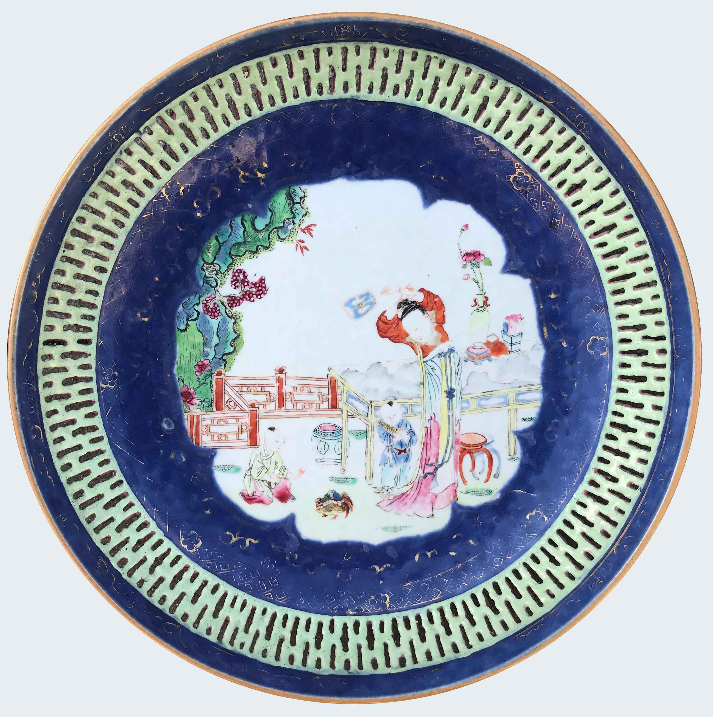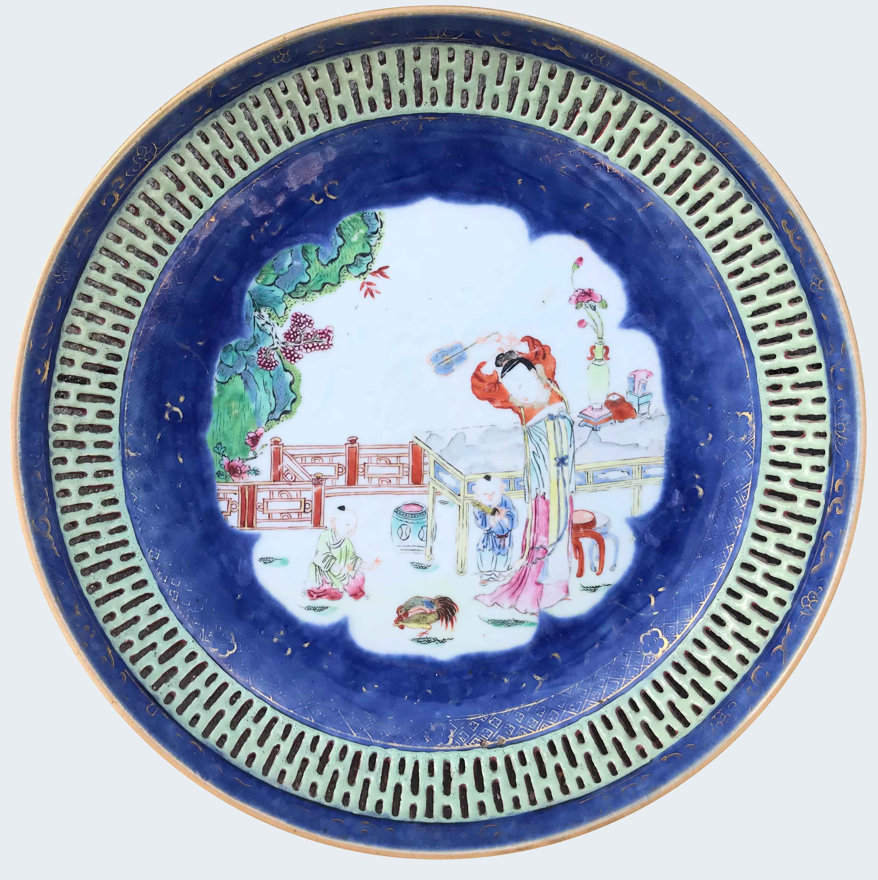 A décor réticulé sur l’aile, le centre peint d’une élégante chinoise avec ses deux enfants.