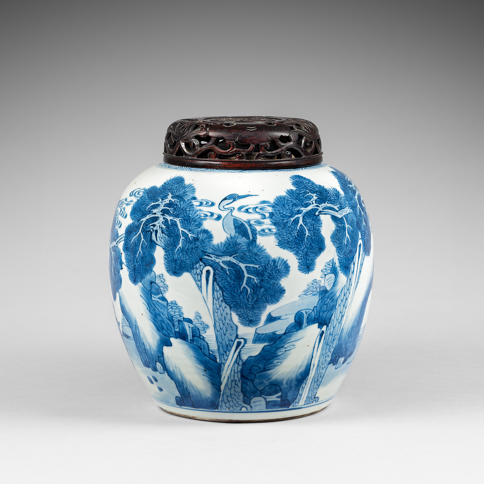 An unusual Chinese blue and white ewer with a scroll handle. Early Kangxi