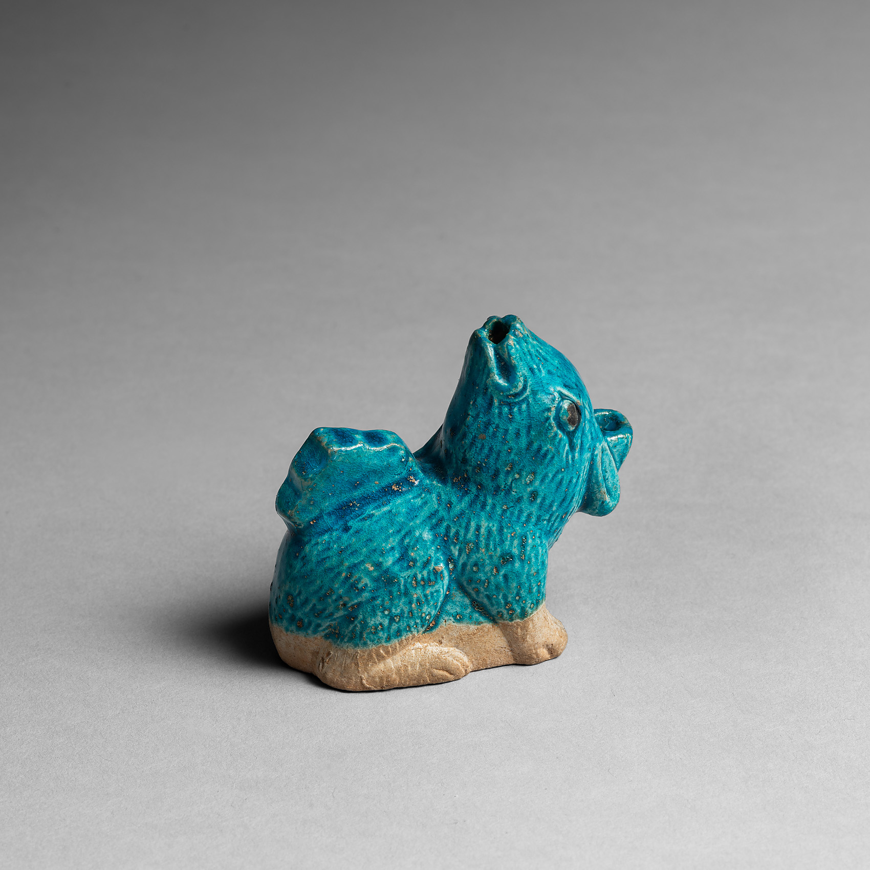 The figure depicts a rabbit lying down, its head raised toward the sky and mouth slightly open, holding in its jaws a stem of lingzhi fungus, the rounded cap of which rests upon its back. The volumes are full, with the legs folded beneath the body and the head finely proportioned. The animal is covered with a brilliant turquoise glaze. A small opening behind its head allows water to be poured.