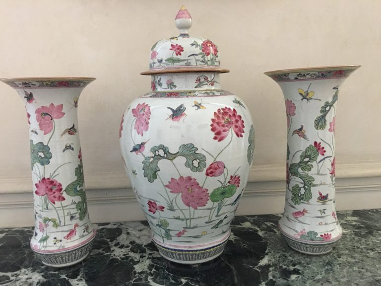 A garniture of three vases with a very similar design, from the collection of the kings of Bavière, is in the Munich Residence.