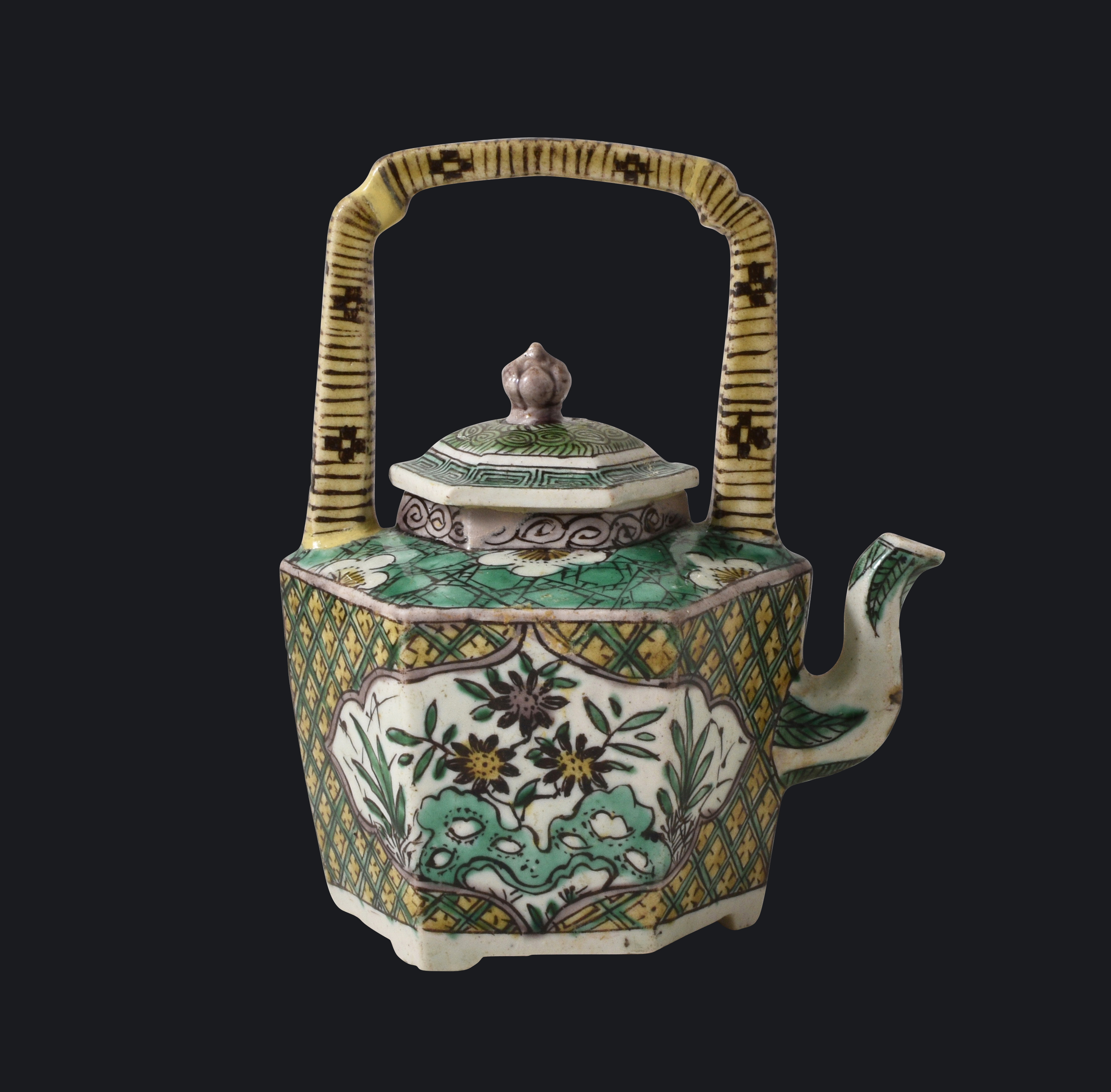 A Chinese teapot decorated with famille verte enamels on the biscuit. Kangxi period