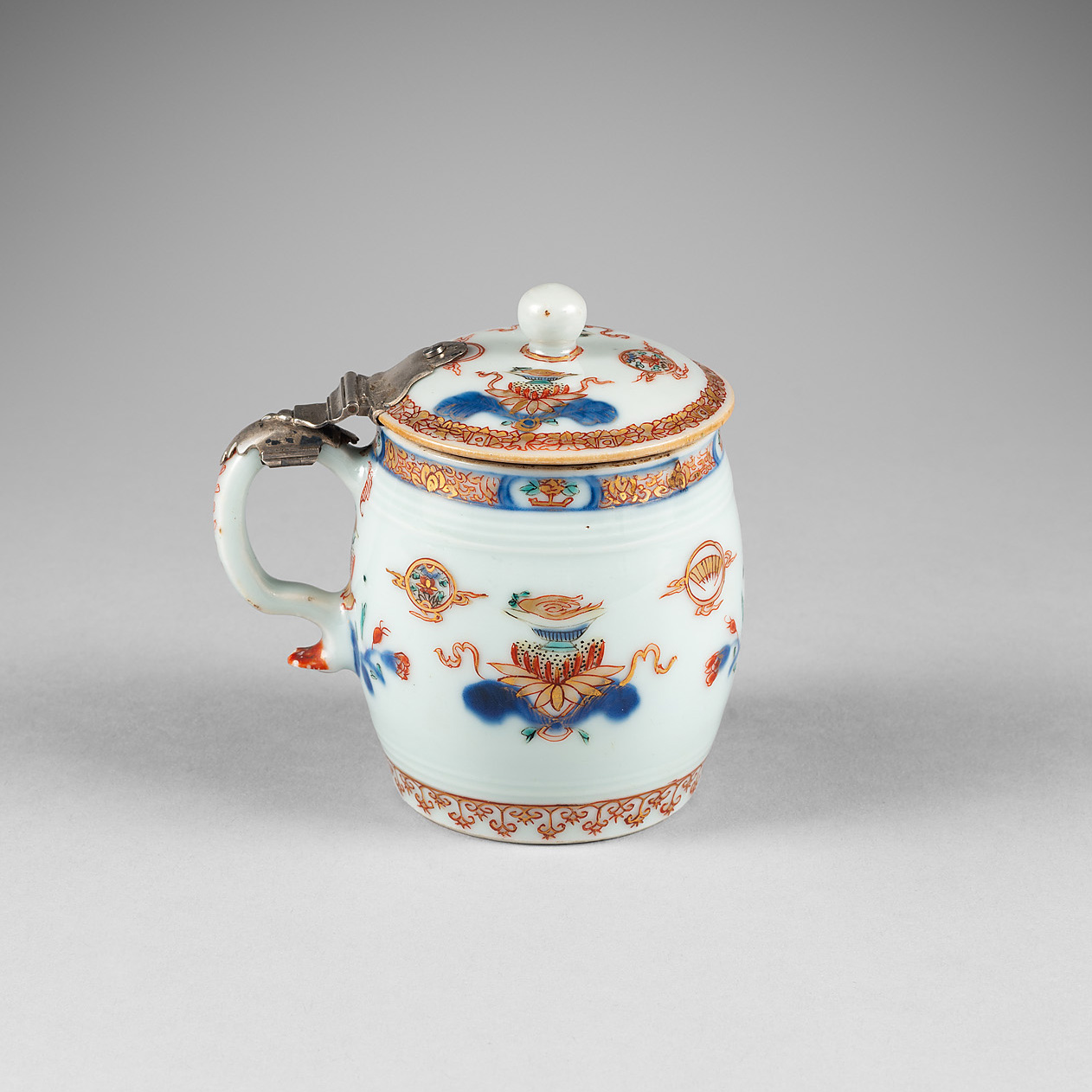 The mustard pot is decorated in the famille verte palette with translucent enamels and features the decor ordered for Louis XV, King of France (1710-1774). The main motif is an underglaze blue double lotus leaves holding a chrysanthemum flower, itself surmounted by a basket with citrus fruit. Additional motifs on the pot include a spray of peonies; fans and chrysanthemum heads enclosed within rounded cartouches.