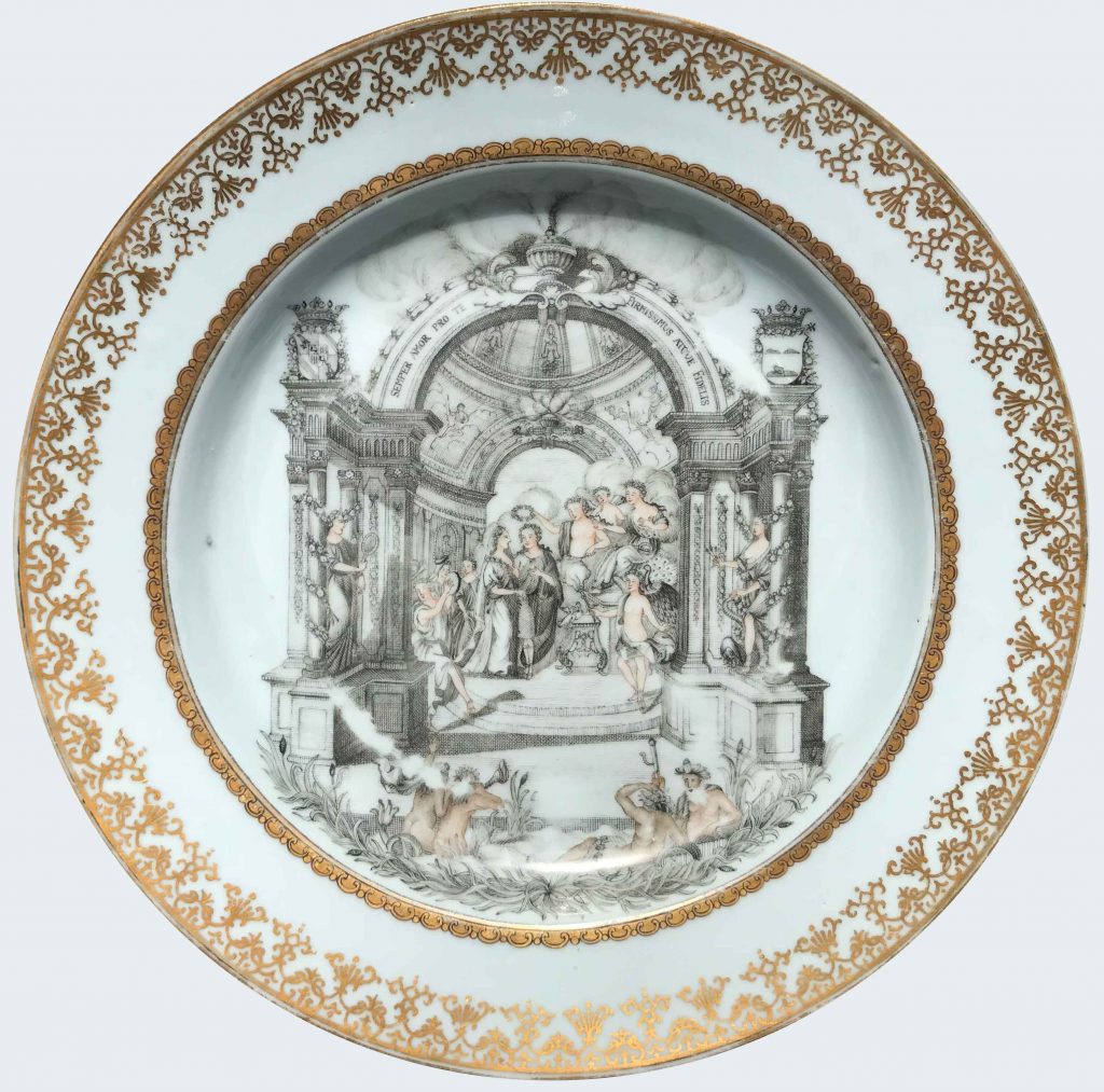 A Chinese “en grisaille” and gilt marriage plate for the Dutch market. Yongzheng period.