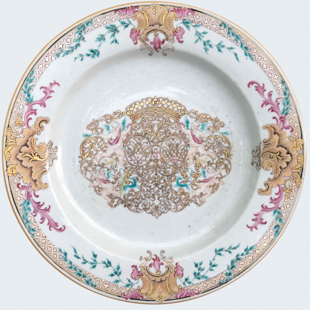 A large Chinese pseudo-armorial plate decorated with cherubs. Qianlong period.