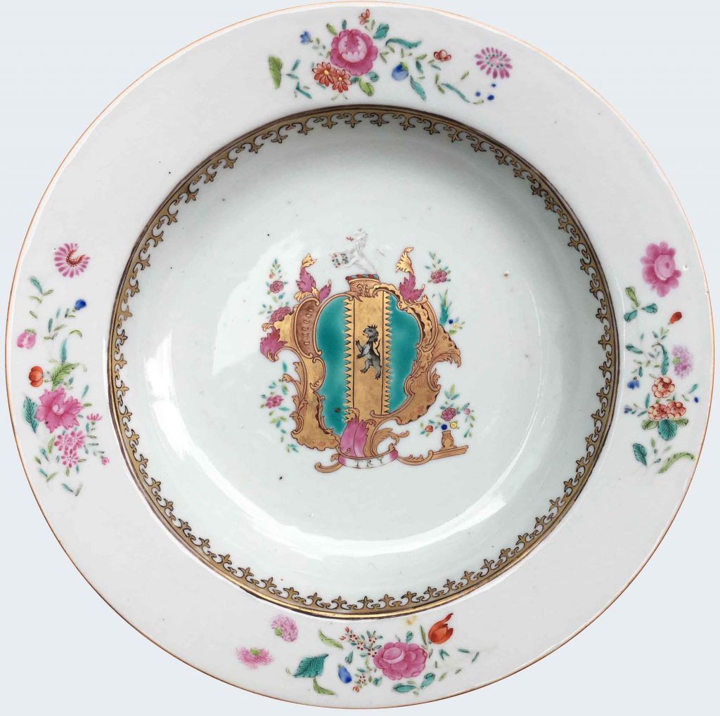 Decorated in the famille rose palette, to the center with the arms of O’Hara, Vert, on a pale radiant or a lion rampant sable ; crest ; A demi lion rampant ermine, holding in the dexter paw a chaplet of laurel vert, fruited gules ; motto “Try“.