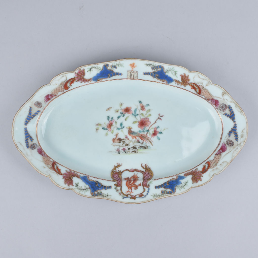 Of oblong form and lobed outline, painted in the center in the famille rose palette, with a pair of pheasants perched on rock work beneath overhanging branches of flowering tree peony, the rim painted with the arms of Drake, opposite the crest of a castle surmounted by a wyvern, reserved in a border of multi-colored […]