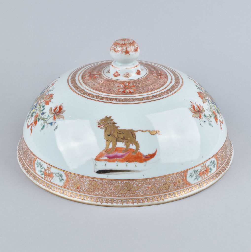 Very heavily potted, of domed shape with moulded lip and large ball finial on pedestal. The outside finely painted with bands of rouge-de-fer and gold, and a crest among famille verte sprays, the crest of Talbot On a cap of maintenance gules, turned up ermine, a lion statant, and in the famille rose palette inside the cover.