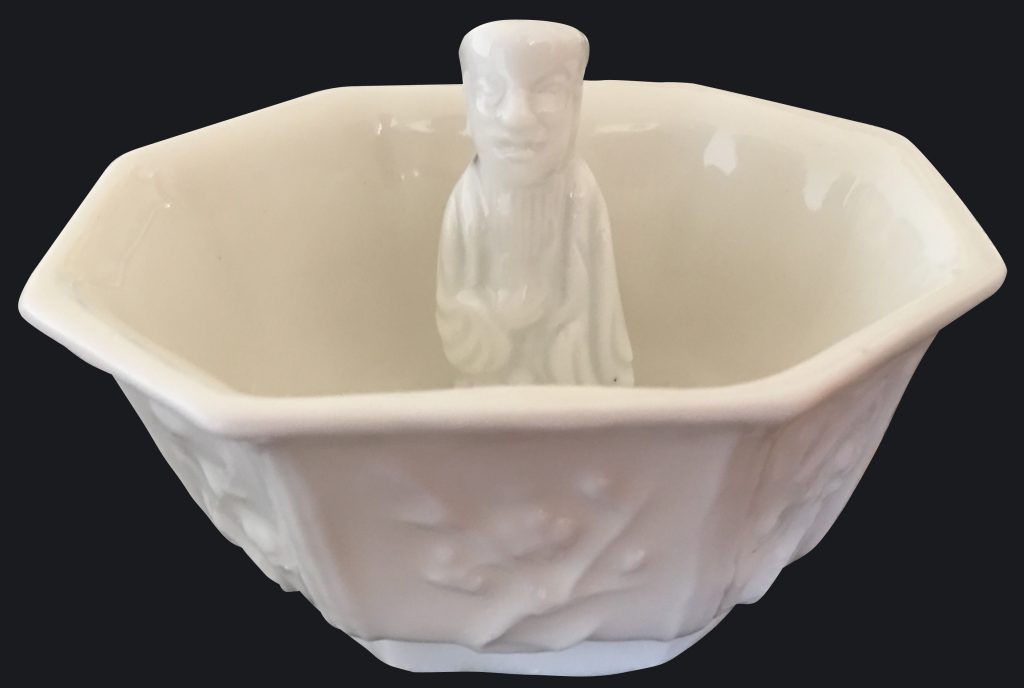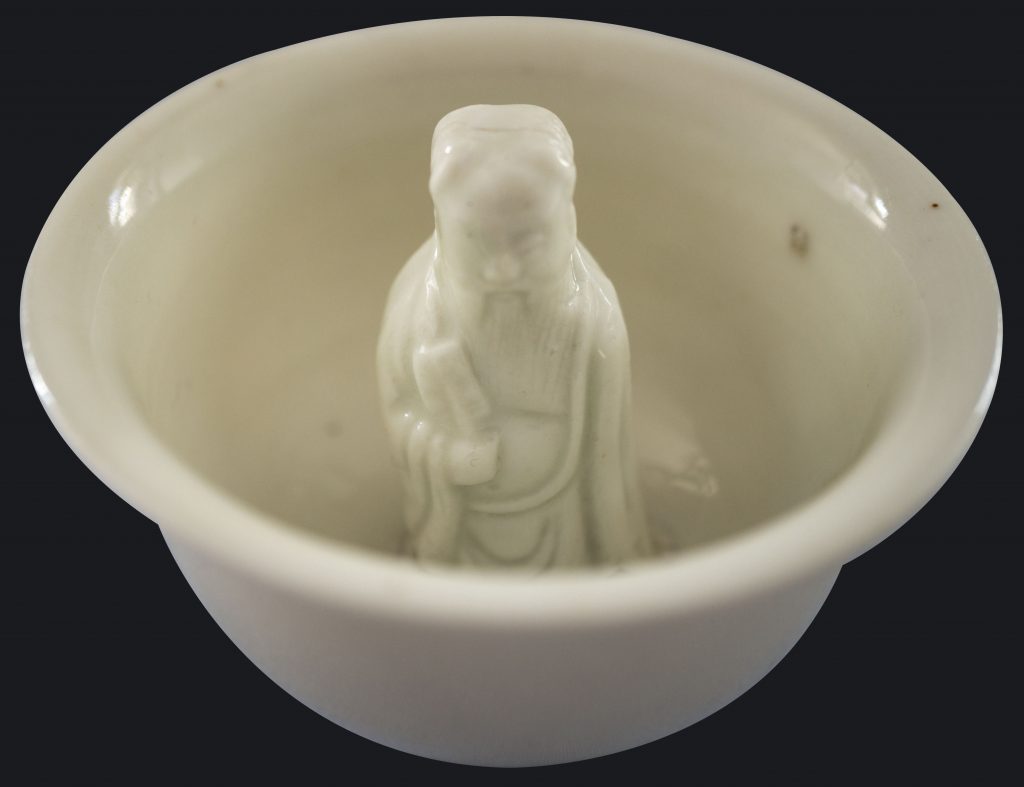 “Trick cup”, also know as « porcelain surprise », « Gong Dao Bei », « don`t be greedy cup », « fairness cup » or « puzzle cup » in blanc de chine, with the central figure of Han Zhongli, one of the eight immortels.