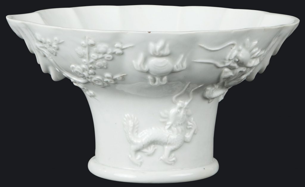 Libation cup “Blanc de Chine” with wavy rim and spreading foot. The sides are moulded with a prunus branch, a dragon pursuing a pearl and a ch’i-lin on one side, and a pine branch, crane, moon and tiger on the other. Porcelain of cold grayish-white tone.