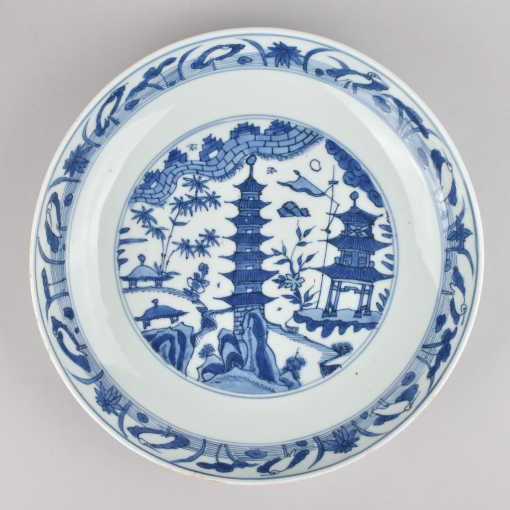 Decorated in underglaze blue, with a temple, a pagoda, and ducks on the rim.