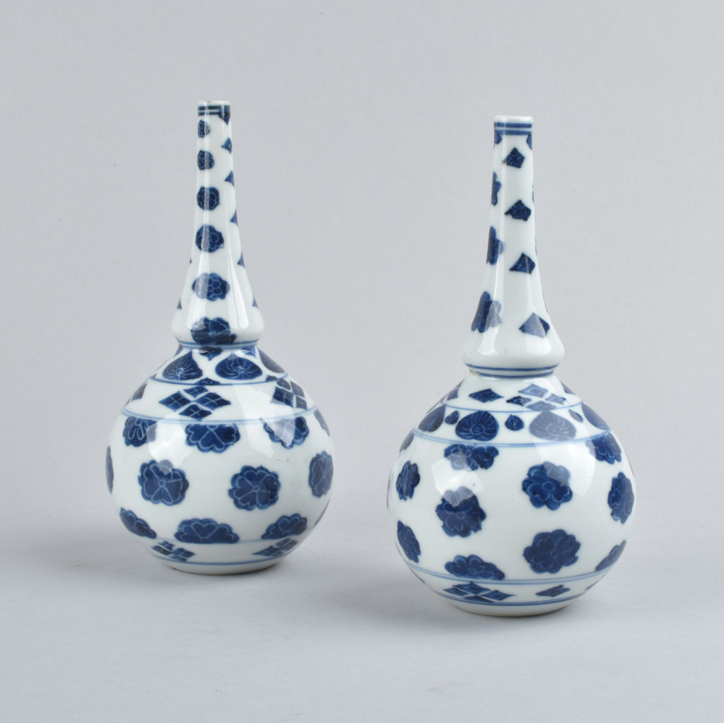 Two Chinese export porcelain sprinklers on footing, with a spherical body and tall, tapering neck rising from an angular swelling and decorated in underglaze cobalt blue with symmetrically arranged single rosettes, petals and squares in horizontal hands. Marked with artemisia leaf.