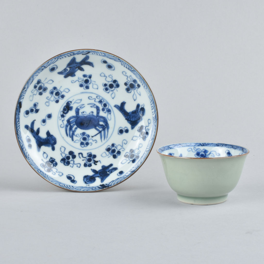 A Chinese blue and white / celadon ground tea bowl and saucer. Kangxi