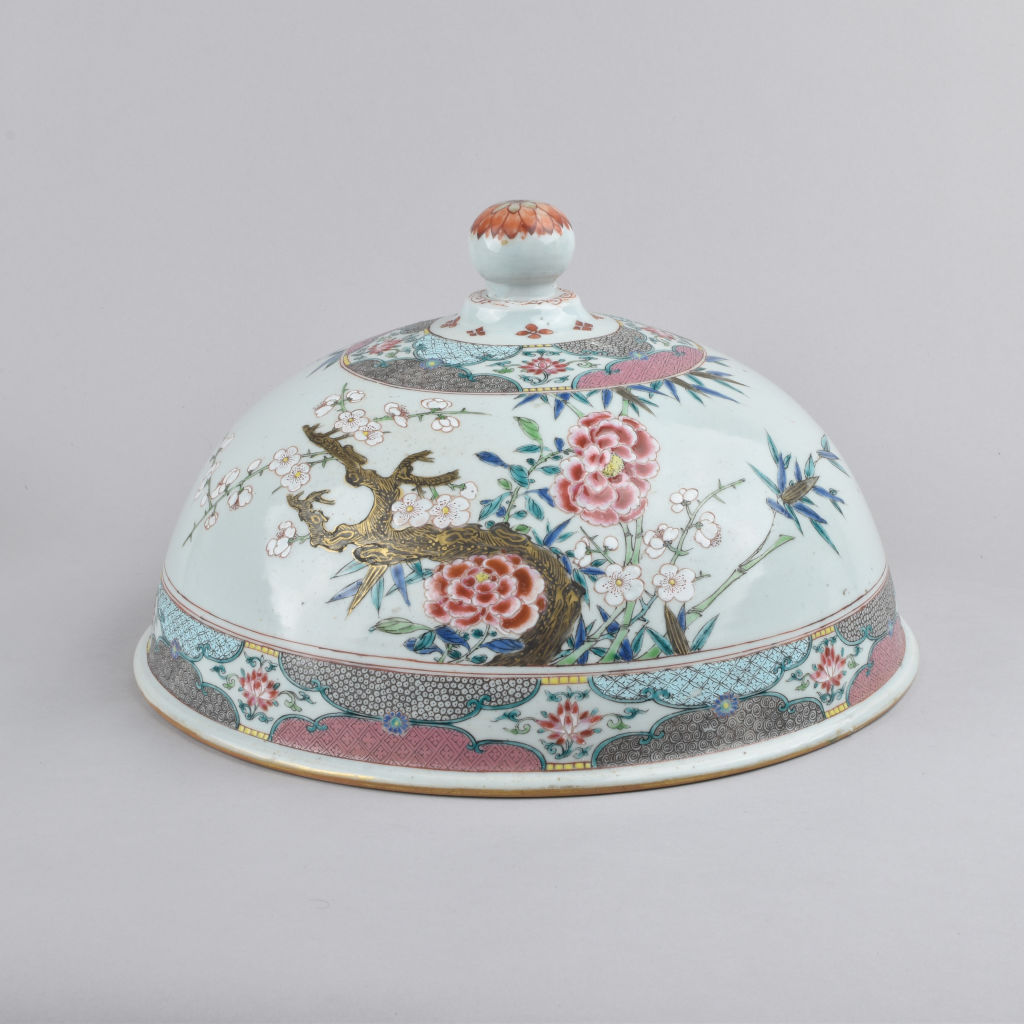 Bell-shaped domed cover with a small rim and mushroom-shaped finial on top. The decoration painted in famille rose enamels and gilding, with several different diapers and treillis patterned bands on the outside, the central design prunus and peonies.