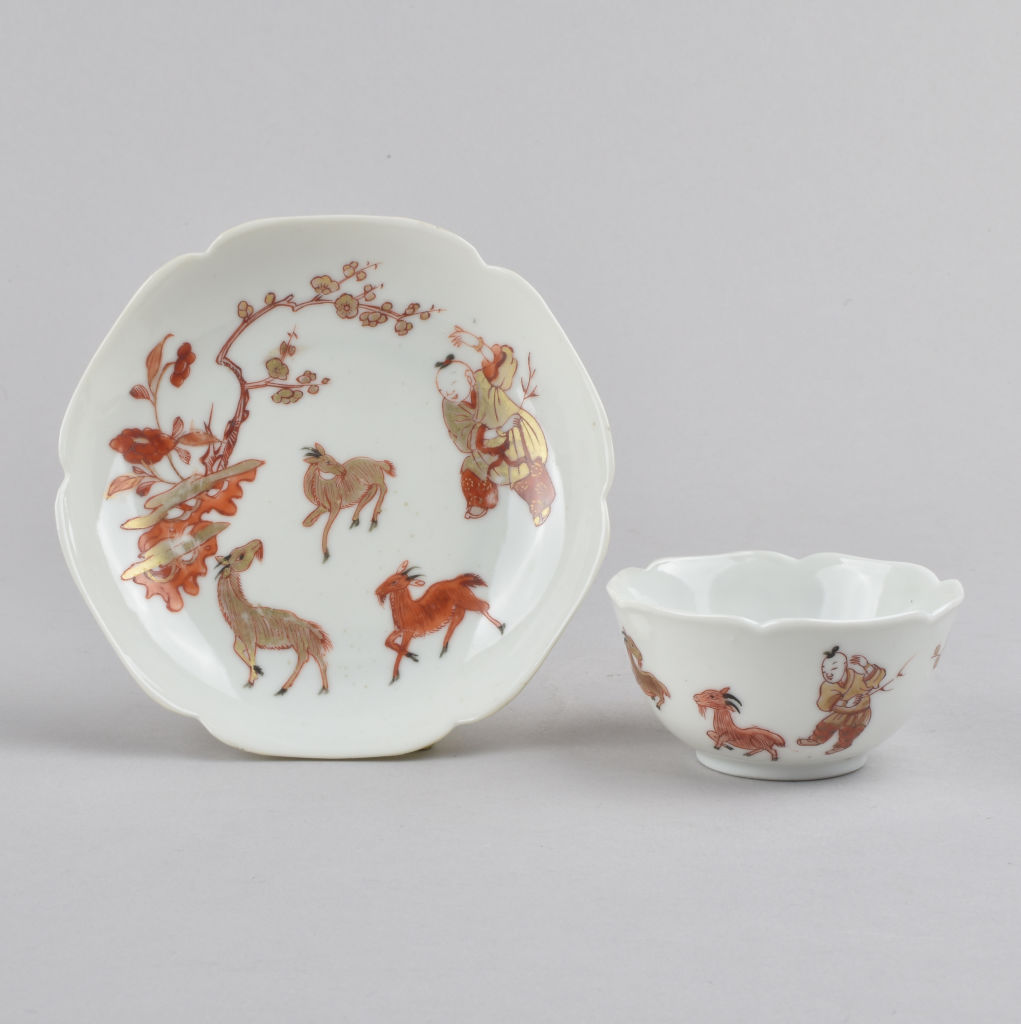 Of polylobed form, and decorated with a boy herding three goats next to a prunus.