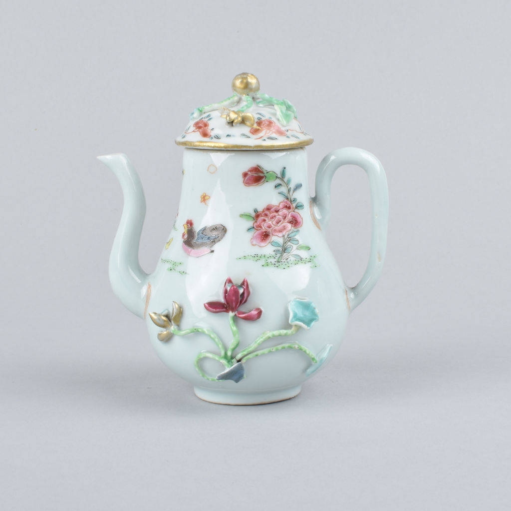Of pear shape with long curving spout and hight curved handle, the body and cover with applied moulded lotus stems and leaves, and painted with cockerels among peonies in riche famille rose enamels.