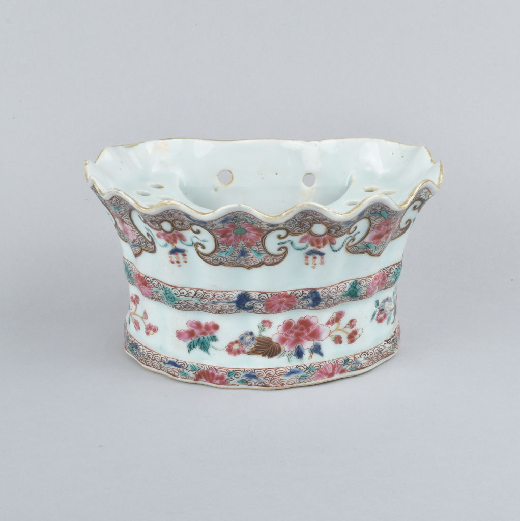 Decorated in the famille rose palette and modelled as a pique-fleurs with scalloped sides, the wavy rim decorated with lappet-shaped whorl-pattern borders enriched with peonies above two similar horizontal bands, the inner rim and back pierced with apertures.