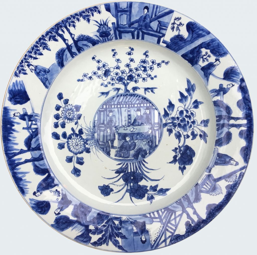 Decorated in underglazed blue, the raised center is decorated with an interior scene with figures, surrounded by prunus, peonies, chrysanthemums and water lilies. The everted rim is decorated with further scenes of ladies.