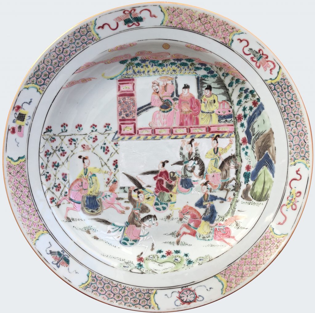 Enamelled in the famille rose palette and gilt, with a scene of the Yang Jia Jiang Yanyi (The Generals of the Yang Family), with six female warriors on horseback in a garden being watched by a dignitary and attendants on a pavilion balcony, the rim with a band of cell and trellis-pattern and reserved with six […]