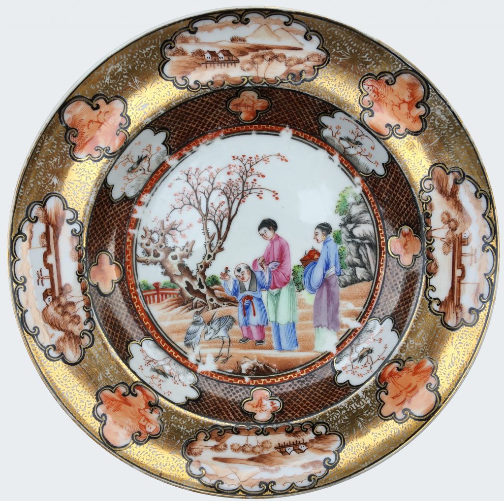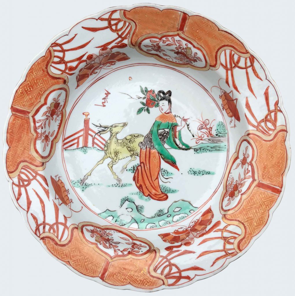 With shaped, lobed tim and deep well, decorated in rouge-de-fer, gold and famille verte enamels, with a maiden-goddess bearing a spray of fruit on a terrace, while a spotted yellow deer runs beside her, looking up. The rim in rouge-de-fer and gold, the design in imitation of Kraakware.