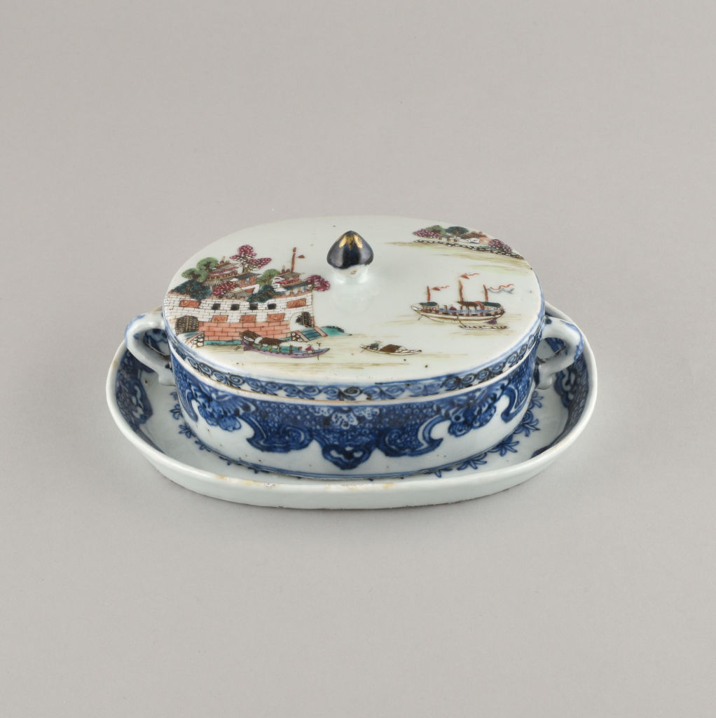 A Chinese famille rose “Dutch folly fort” butter dish and stand. Qianlong period