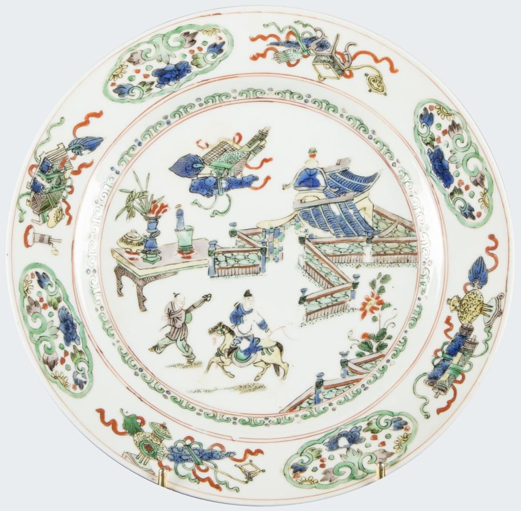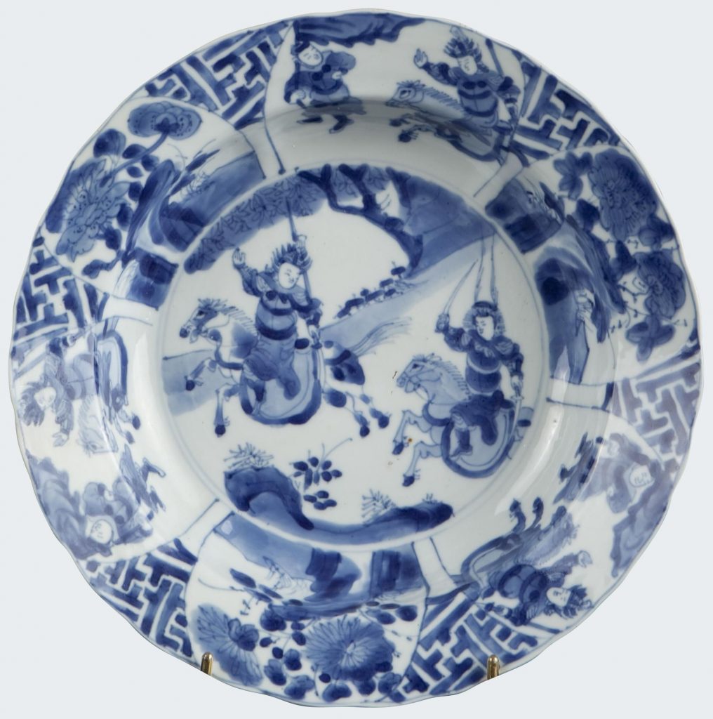 A Chinese dish decorated with horsemen. Kangxi period and mark.