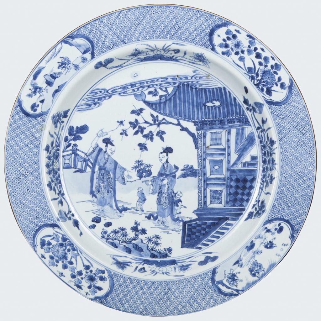 Decorated in underglazed blue with two ladies in a terraced garden near an architecture, the rim with four shaped cartouches containing figures in landscapes and flowers.