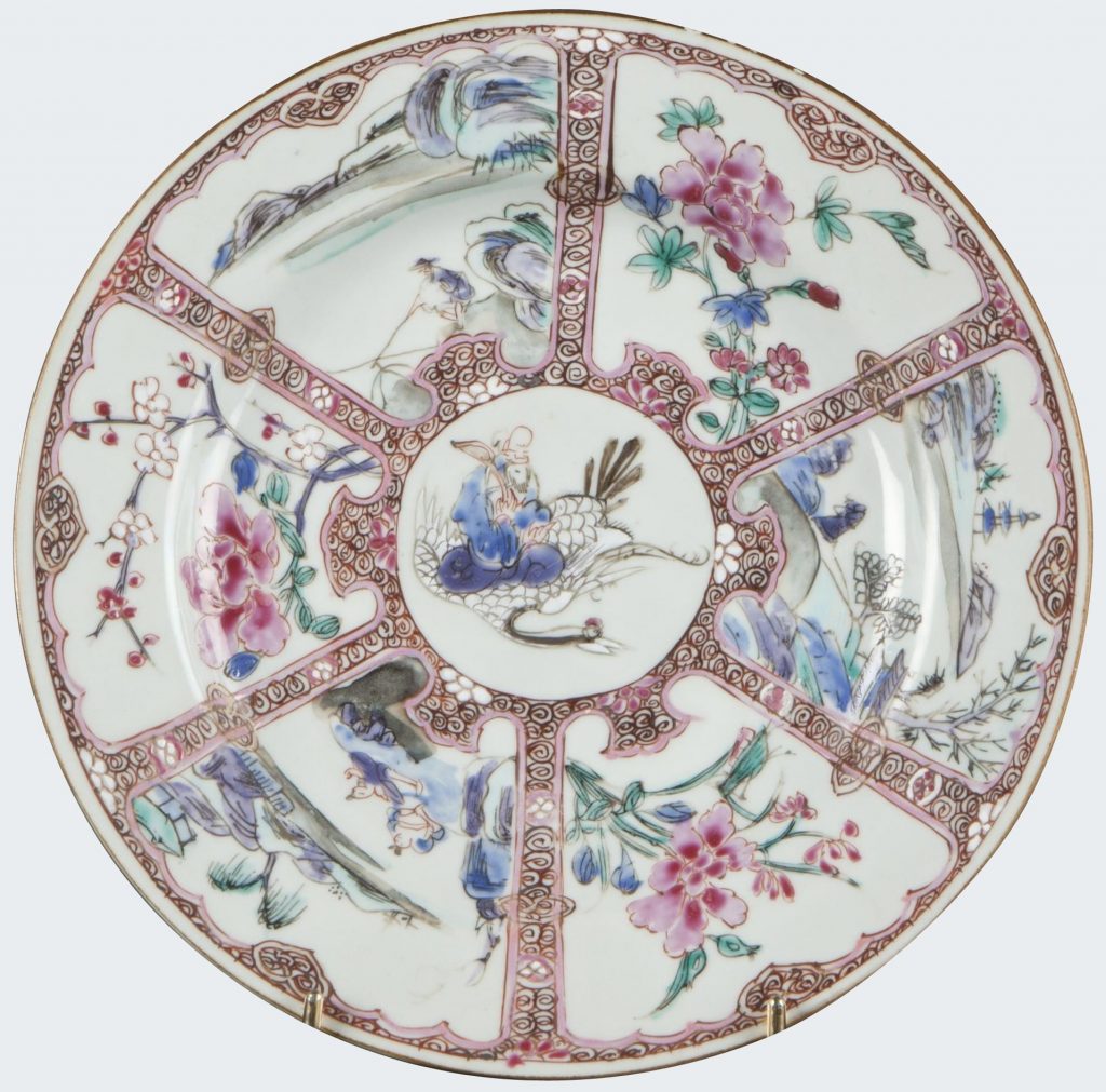 Decorated in the famille rose palette with a central medallion encircled by ruyi, with Laozi on his crane . On the rim, panels of landscapes and peonies.