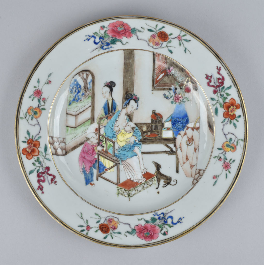 Finely enameled in the famille rose palette, with a Chinese lady sitting on a chair and breastfeeding his baby, with her son, a dog and a maid beside her.