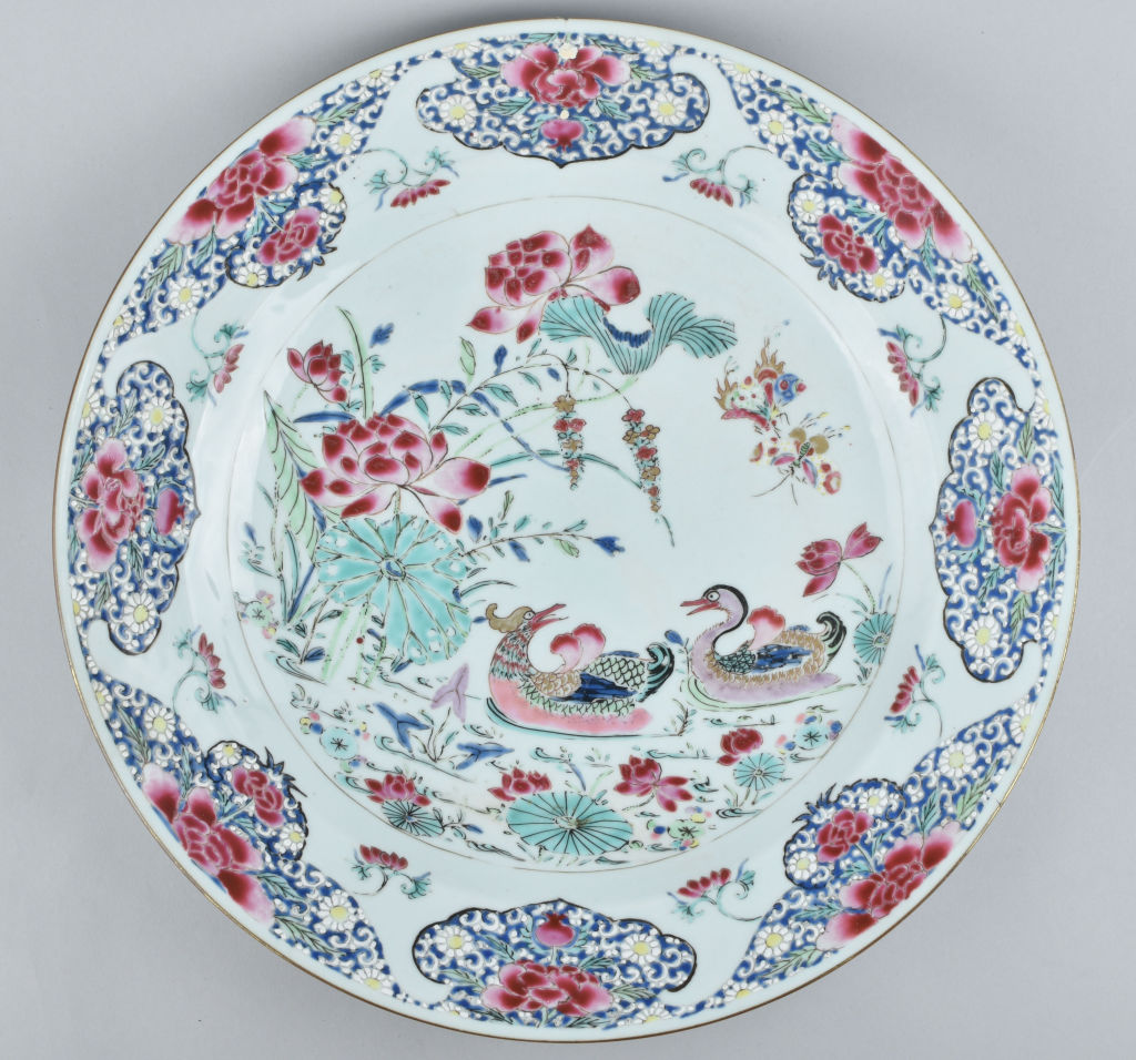 A very large Chinese famille rose charger decorated with mandarin ducks. Yongzheng