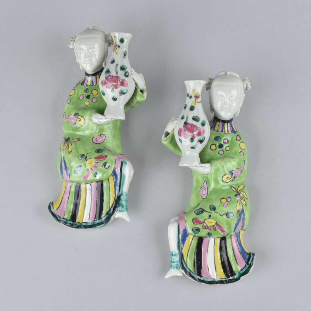 Each in the form of a maiden clasping a vase at her shoulder, and dressed in a green-ground tunic decorated with scattered flowers, over a striped skirt.