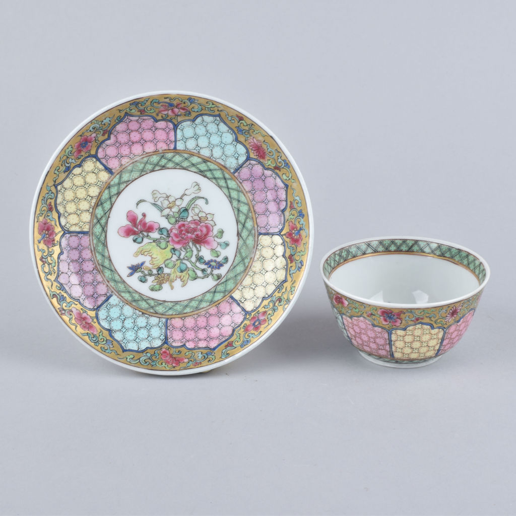 Of oblong form and lobed outline, painted in the center in the famille rose palette, with a pair of pheasants perched on rock work beneath overhanging branches of flowering tree peony, the rim painted with the arms of Drake, opposite the crest of a castle surmounted by a wyvern, reserved in a border of multi-colored […]
