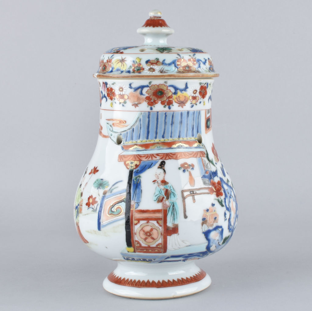 Decorated in the famille rose palette, with court ladies in garden pavilions, the border with blooms, on a short pedestal foot, the cover with pointed button knop, pierced to emit scent.