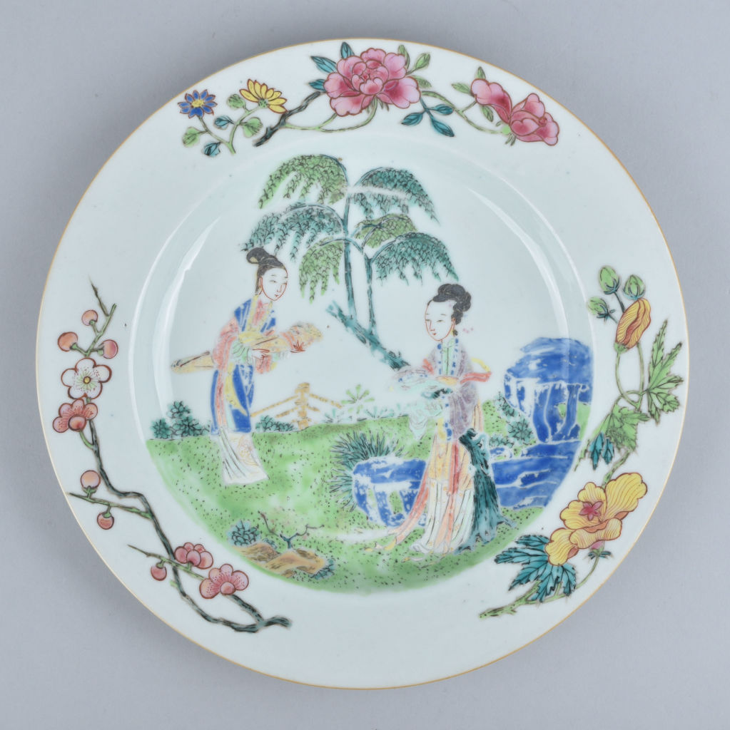 A Chinese famille rose plate decorated with a lady and her attendant. Yongzheng period