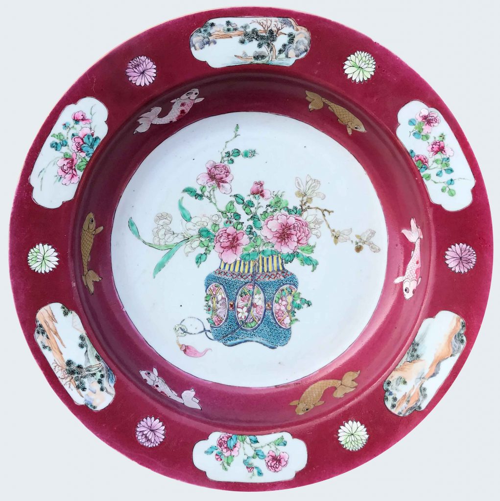 Decorated in the famille rose palette, in the center with a basket of flowers and carps. On the rim, six cartouches depicting landscapes and peonies reserved on a “ruby-pink” ground.