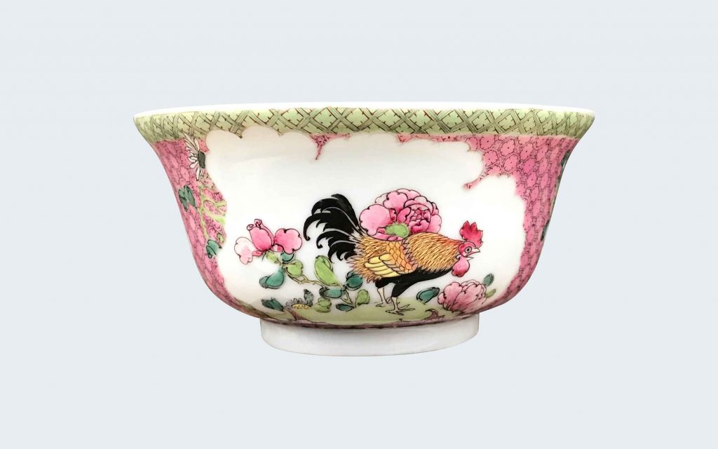 A Chinese famille rose eggshell bowl decorated with a cockerel. Yongzheng period