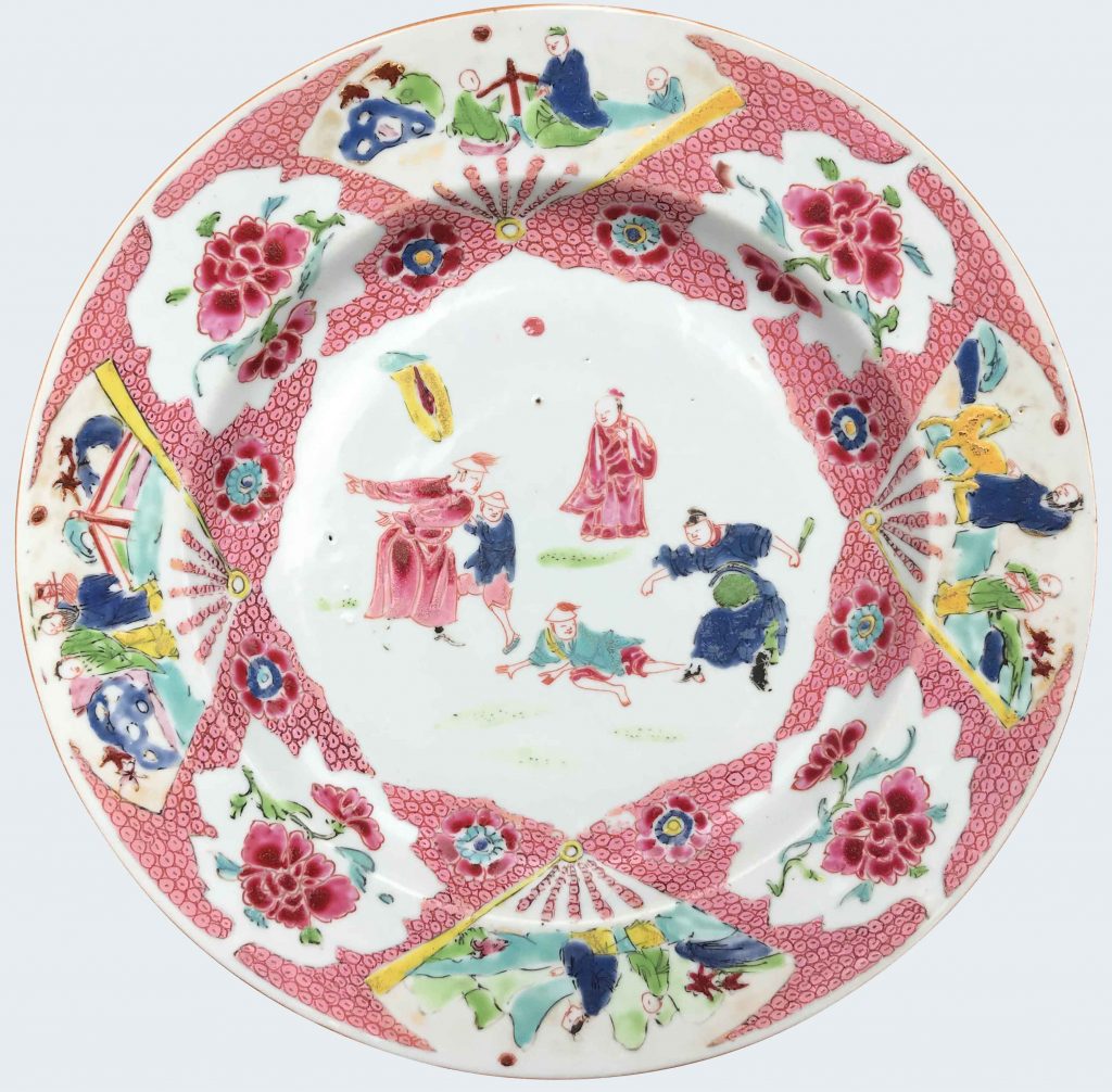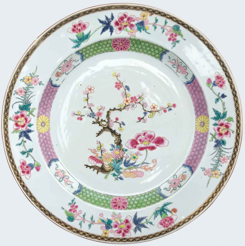 A Chinese famille rose plate decorated with a “bois simulé” ground border. Qianlong period