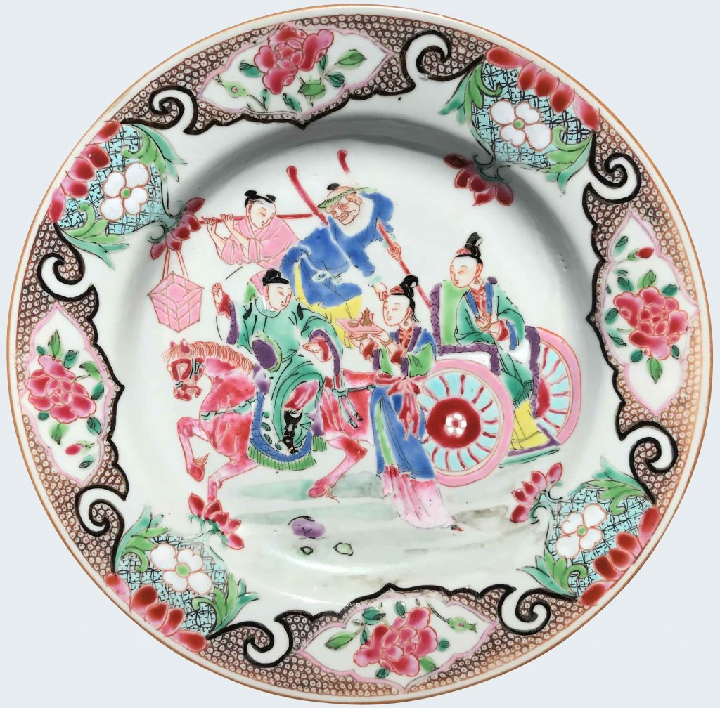 Brightly decorated in the famille rose palette, with a man on a horse and a lady in a chariot accompanied by attendants within sepia “fish-roe” and floral lappets.
