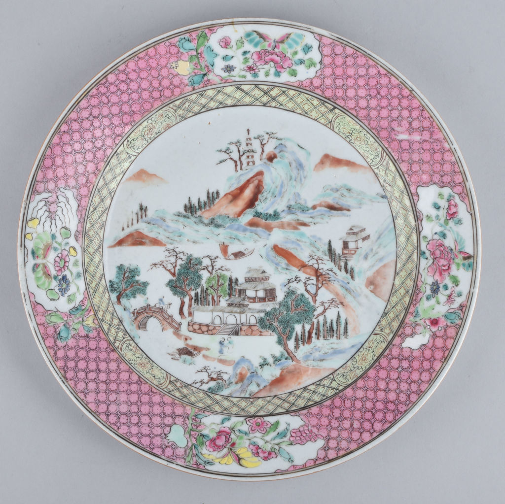 A Chinese famille rose plate decorated with a Chinese landscape. Yongzheng period