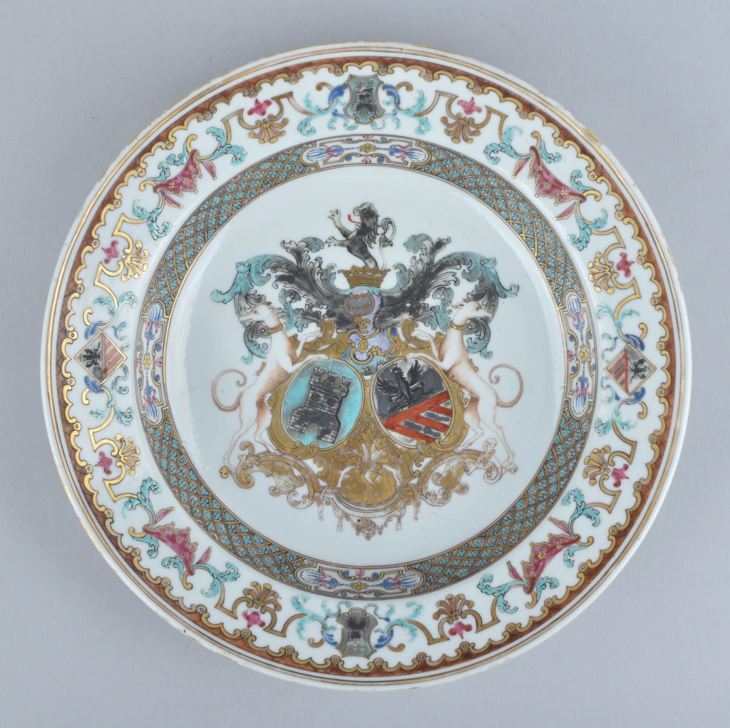Enamelled in the famille rose palette and gilt with a central coat-of-arms for Raón y Guttiérrez, quarterly: 1. or, a gallows, in chief an arm holding a knife argent;2. azure, a tree with a wolf sable against the trunk; 3. or, four bends or and over-all a knife argent;4. azure, a tower argent between two […]
