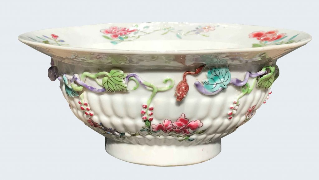 A Chinese famille rose bowl with an applied decoration. Yongzheng period.