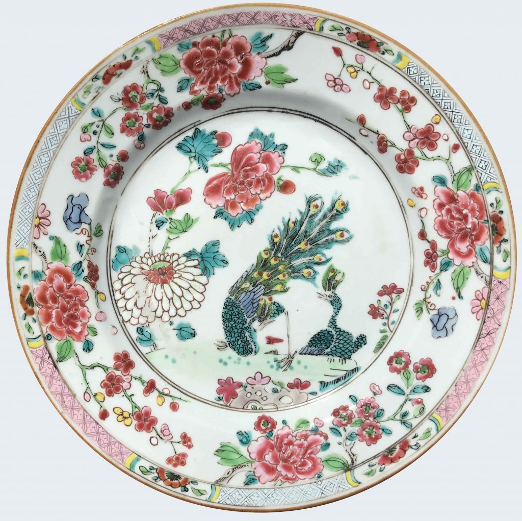 A Chinese famille rose plate decorated with peacocks and peonies. Yongzheng period.