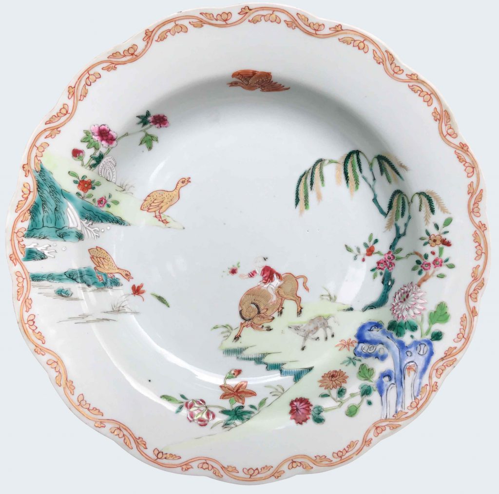 A Chinese famille rose plate decorated with a boy holding a flowering branch. Qianlong period.