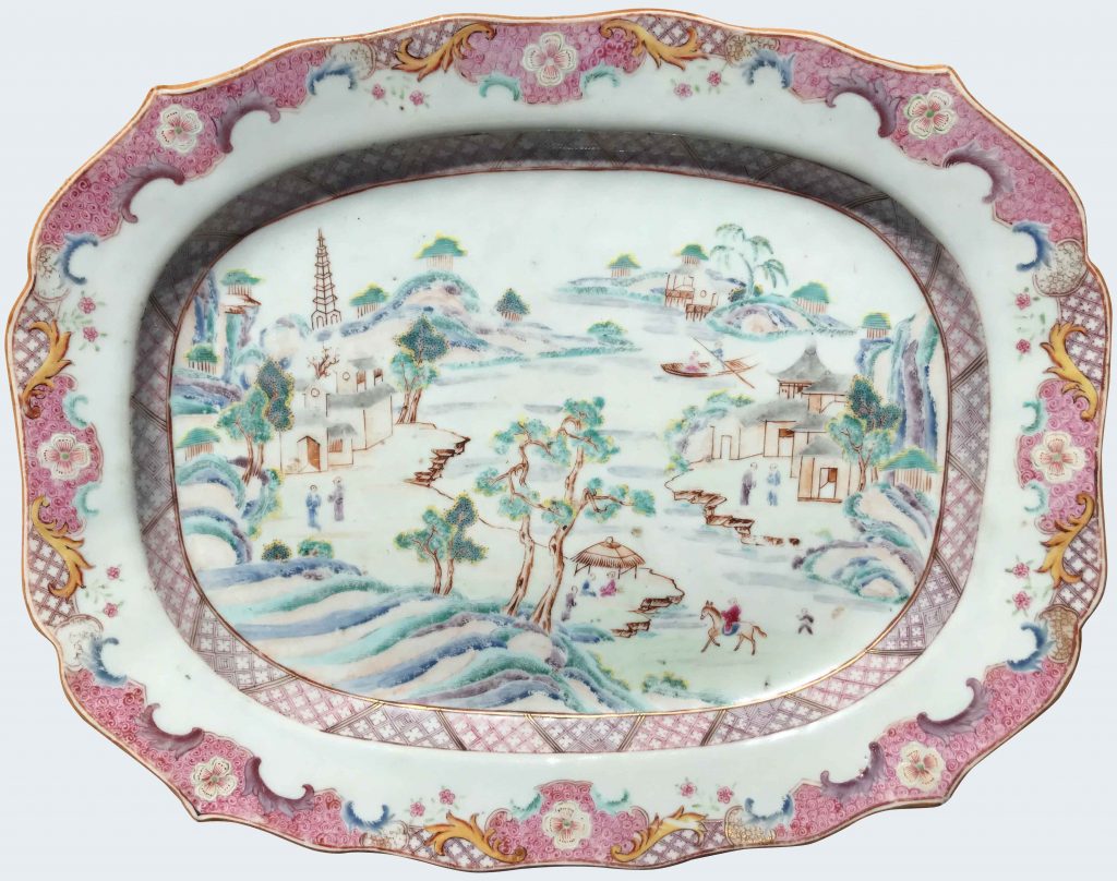Decorated in the famille rose palette, with an important Chinese landscape including a river, a pagoda and a figure riding a donkey.