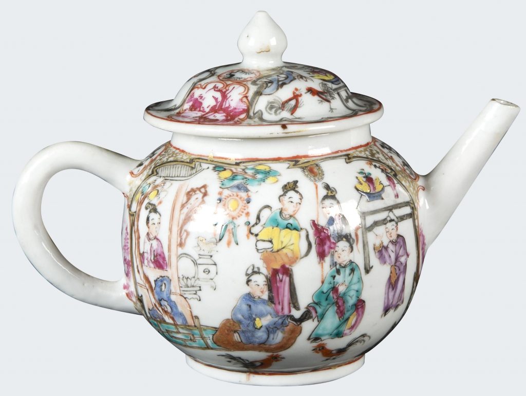 Painted in famille rose enamels, with figures and panels of landscapes or birds.
