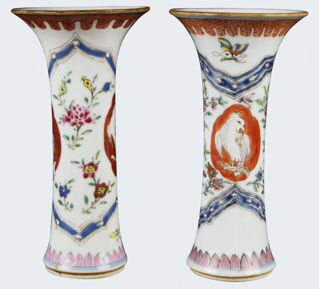 Pair of “vases cornet” painted in the famille rose palette with a parrot within a cartouche, interspersed with scattered flower sprays, enclosed within a scalloped border.