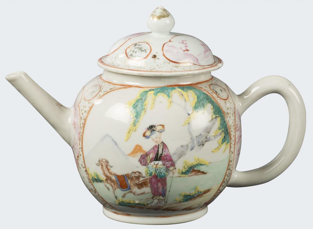 Painted in famille rose enamels, with an stylish ladie in a landscape with a goat.