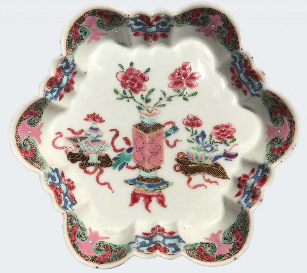 Painted in the famille rose palette and decorated with vases in the ancient archaic Chinese style.
