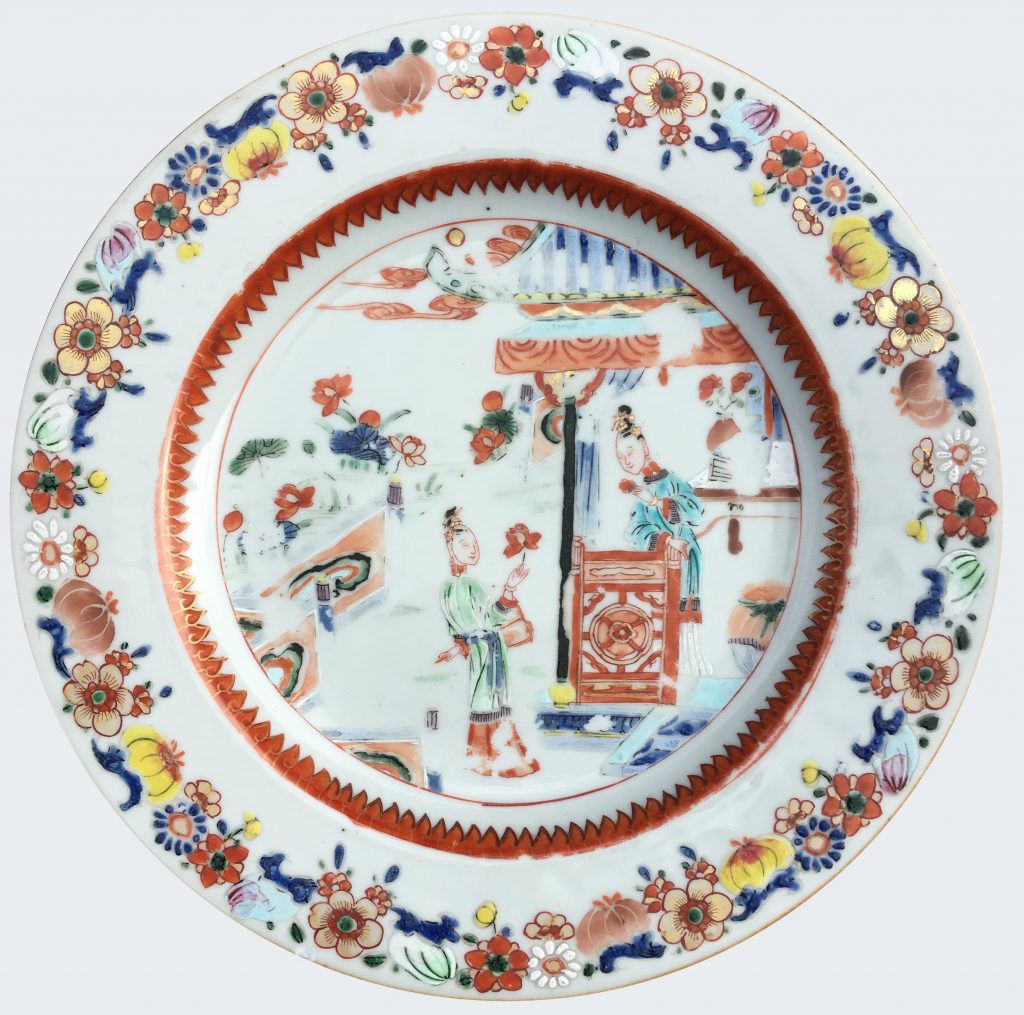 Enamelled at the center with two ladies on a terrace and in a building holding a lotus and a fan, and a peony, within a lappet band at the well and a composite flower and a fruit band at the border including prunus, chrysanthemum, pomegranate and finger citrus.